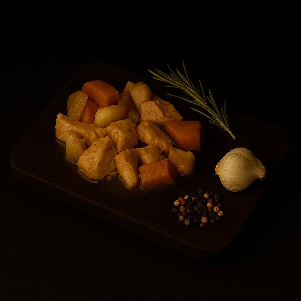 Ingredientes: Carne de gallo añojo de Sanchonuño, aceite de oliva virgen extra, mezcla de vinagres aromáticos (Modena, Jerez, Romero), vino blanco, zanahoria, cebolla, ajo, sal, especias y hierbas aromáticas.